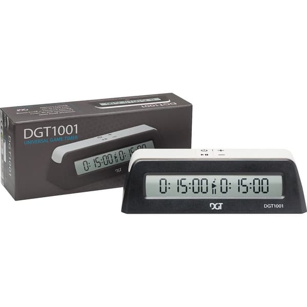 DGT 1001 digital schackklocka är en universell schackklocka med nedräkning och uppräkningsfunktion och 2 stora knappar ovanpå som alla funktioner kan manövreras med. Denna senaste schackklocka från Digital Game Technology har en kristallklar display, är mycket lätt att använda och är mycket lämplig för skolor (skolchack), schackklubbar och för hemmaschackspelare. DGT 1001 är en enkel schackklocka utan speciella tidsinställningar som bonustid.