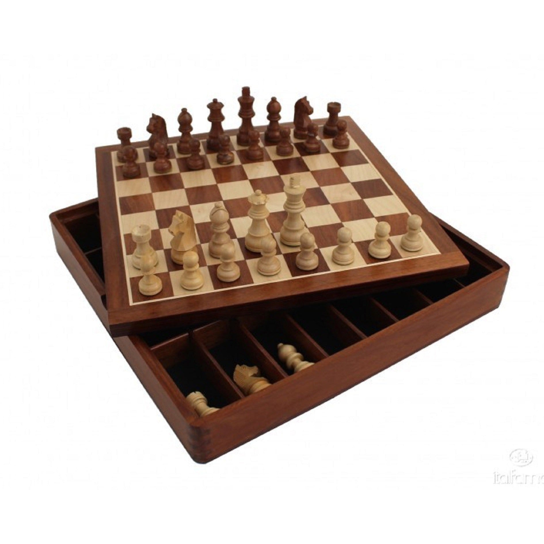 Komplett Schackset Mozart 102 37×37 cm Schackbräde i Gyllene Rosenträ med handinläggningar, med plats för förvaring av schackpjäserna, Löstagbartbräde. Storlek 37×37 cm höjd 5 cm med förvaringsboxen. Schackpjäser i Acacia trä, vägda pjäser, filt beklädnad undertill delvis handgjorda. Kungens höjd 7,6cm diamater 3 cm. Pjäserna passar i schackbrädets förvaringsbox. Artikelnummer: Mozart102